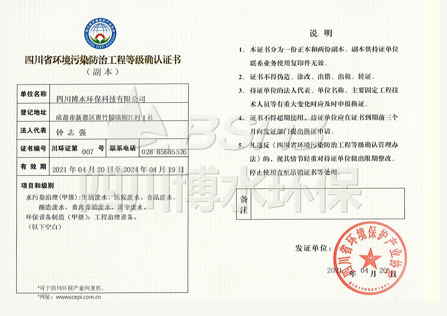 水污染治理等級證書